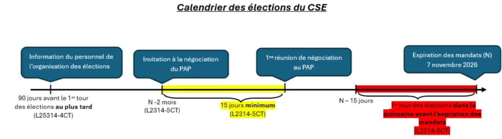 Au cas précis, les mandats du CSE en cours expirent le 7 novembre 2026, dès lors le 1er tour des élections devrait en principe se tenir sur la semaine du 26 octobre 2026 (semaine 44) ou du 2 novembre 2026 (semaine 45).